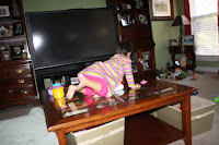 Yep, she is in the middle of the coffee table! She seemed pretty proud of herself. She even threw in a 'che' for me. Nice!!